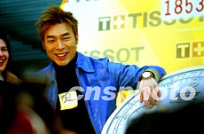 瑞士天梭表TISSOT全球總裁弗朗索瓦·添寶(右)十四日在上海新天地向香港明星許志安(左)贈送名表,由此展開其世界巡回展中國大陸地區第一站。作者:劉殊瑾