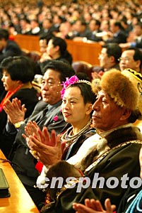十屆全國人大一次會議十七日舉行第七次全體會議,表決全國人大各專門委員會組成人員,決定國務院副總理、國務委員、各部部長、各委員會主任、中國人民銀行行長、審計長、秘書長人選。圖為代表鼓掌祝賀新一屆政府組成。作者:毛建軍