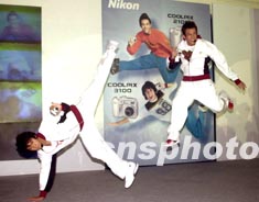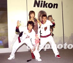 人氣新組合Boy'Z兩名成員關(guān)智斌(Kenny) (左)、張致恒(Steven) 3月17日晚在香港出席Nikon全新相機(jī)新聞發(fā)布會(huì)。出道不久但人氣急升的Boy'Z兩名成員,以充滿活力的高難度動(dòng)作為Nikon展示COOLPIX 2100及COOLPIX 3100數(shù)碼相機(jī)。鄧慶樂 攝