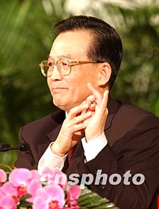 被瑞士駐華大使稱為具有計算機頭腦的中國新任總理溫家寶,三月十八日在中外記者招待會上用數字手勢述說國家的前景。作者:賈國榮