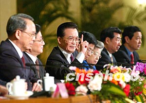 三月十八日,十屆全國人大一次會議閉幕后,新任國務院總理溫家寶和四位副總理一起與中外記者見面。作者:張煒