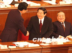 新當選的中國國家主席胡錦濤,三月十八日在十屆人大一次會議的閉幕式上,向上屆總理朱镕基握手致謝。作者:賈國榮