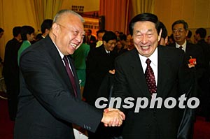 十屆人大一次會議十八日上午在北京人民大會堂閉幕,出席會議的香港特別行政區行政長官董建華與前總理朱镕基話別。作者:毛建軍