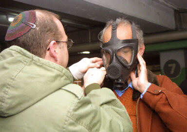 2003年3月18日在耶路撒冷分配中心,以色列軍隊的士兵指導以色列人使用防毒面具,軍隊今天命令以色列人準備封閉的房間來避免伊拉克可能使用的化學攻擊帶來的危害。