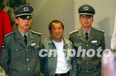 香港演藝名人曾志偉二十六日亮相在北京舉行的香港時尚匯展場館,被保安拉住合影。作者:毛建軍