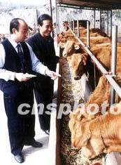 山東省棗莊市山亭區農村信用社,大力扶持當地農民發展畜牧養殖業,使該區養殖專業戶達到四千六百多家。圖為信用社主任(左)向養牛專業戶了解牛的生長情況。作者:李宗憲