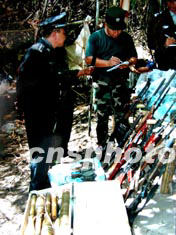 <div=left>中緬警方合作摧毀金三角一毒品加工廠,緬甸警方清理登記繳獲的槍支彈藥。作者:張磊