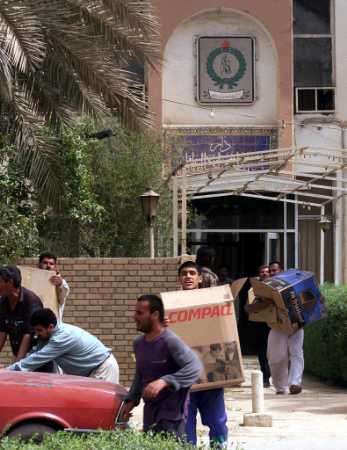 路透社記者看到伊拉克人群首先洗劫了設在巴格達運河賓館的聯合國駐伊拉克辦事機構。另有一名目擊者稱,伊拉克劫掠者還在遭到美軍轟炸的伊拉克奧林匹克委員會大樓附近大肆搶掠各家體育用品商店里的貨物。