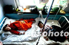 “三一九”豆奶事件后二十天,五歲的史雨平(右)與六歲的王秀文仍在海城市中心醫(yī)院打點滴。當(dāng)?shù)卣Q,自3月19日當(dāng)?shù)?所小學(xué)學(xué)生飲用豆奶以來,先后已有2500多名學(xué)生出現(xiàn)了腹痛、頭暈、惡心等不良反應(yīng)。作者:鄭萍萍