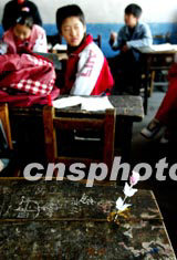 遼寧海城市鐵西小學(xué)六年級三班學(xué)生在李洋生前的課桌上擺上塑料花,表示哀悼。這是“三·一九”豆奶事件中惟一一例死亡事件,但官方稱,尚不能確定死亡原因是否和豆奶中毒有關(guān)。作者:鄭萍萍