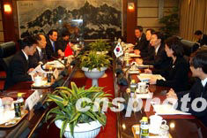 中國外交部長李肇星十日在北京與韓國外交通商部長官尹永寬舉行會談。作者:毛建軍