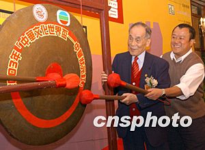 2003年“中華文化世界杯-中華狀元紅,四月十一日在香港舉行啟動儀式,世界杰出華人基金會主席莊世平、“中華文化大使”曾志偉(右)在啟動儀式上鳴鑼。作者:錢興強