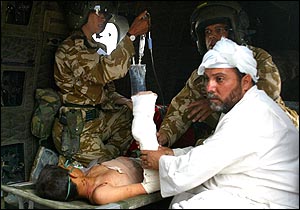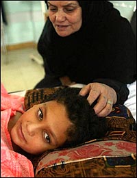 三天前,阿里對泰晤士報記者說,他最喜歡的學(xué)科是地理,因為他想旅行。昨天他忍著巨大的疼痛轉(zhuǎn)頭向他叔叔問:“我是不是很快就能旅行了?”他叔叔說他不但很快就能旅行,而且還能去捕魚。阿里家住巴格達東南部,在一次轟炸中他的床單著火,他自己火燒傷。在這次事故中,他的父母也雙雙死于這次襲擊,當時他母親已經(jīng)懷孕5個月。另外,他的兄弟和幾個姐妹也遇難。
