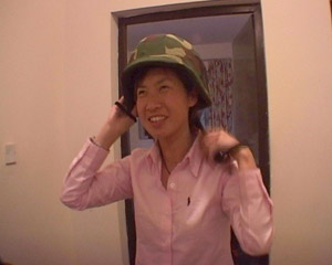 香港鳳凰衛視女記者閭丘露薇在伊拉克試戴鋼盔