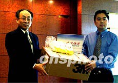美國紐約哥倫比亞大學中國學生學者聯誼會購買了五千只世界衛生組織推薦的N九五防護口罩,贈送給戰斗在抗擊非典型肺炎第一線的中國醫務工作者。二十九日哥大學生代表將口罩樣品和捐贈清單交給中國駐紐約總領事張宏喜(左)。作者:趙海燕