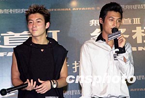 歌星余文樂、陳冠希5月2日在香港出席電影《無間道Ⅱ》及《無間道Ⅲ終極無間》新聞發布會,余文樂、陳冠希早前傳聞不和,今天兩人大方地站在一起宣傳新片。鄧慶樂 攝