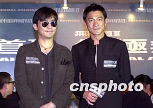 影星梁朝偉、劉德華5月2日在香港出席電影《無間道Ⅱ》及《無間道Ⅲ終極無間》新聞發布會,兩位影帝將在《無間道Ⅱ》及《無間道Ⅲ終極無間》大斗演技。鄧慶樂 攝