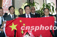 已有七十四年歷史的紐約傳統僑團三江公所四日舉行升掛五星紅旗儀式,中國駐紐約總領事張宏喜(右)、副總領事黃惠康(左)專程到紐約華埠向三江公所主席胡運熹(中)授贈五星紅旗。三江公所是繼至孝篤親公所之后紐約華埠第二家升掛五星紅旗的傳統僑團,以此表示擁護“一個中國”原則,祝愿中國繁榮昌盛。中新社記者:趙海燕