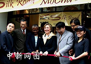 紐約州聯(lián)邦參議員希拉里·克林頓五日到訪紐約華埠,與社區(qū)人士探討振興華埠議題,澄清“非典”謠言,并按照中國(guó)傳統(tǒng)方式為新張的“絲路”咖啡屋剪彩。中新社記者 趙海燕 攝