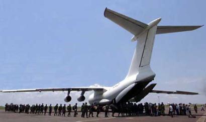 資料圖片:2002年9月19日,剛果(金)士兵登上俄制貨機,準備從金沙薩飛往南方卡坦加省