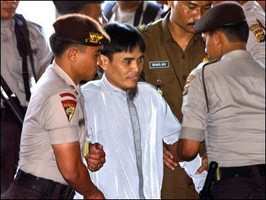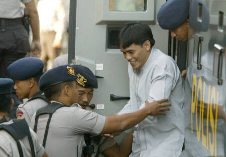 印度尼西亞度假勝地巴厘島2002年10月受到爆炸攻擊,造成200喪生,死者大部分為外籍人士。巴厘法院2003年5月12日傳喚爆炸案主嫌阿姆魯濟,正式展開本案的審理程序。圖為阿姆魯當天上午在重重警力包圍下,抵達法院出庭。
