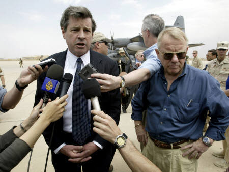 新任美國駐伊拉克行政長官布雷默(左)12日飛抵伊拉克巴格達機場,正式到職就任。布雷默將接替前美國將軍加納,負責監督伊重建工作與政治重組。圖為布雷默當天在巴格達機場接受媒體訪問。