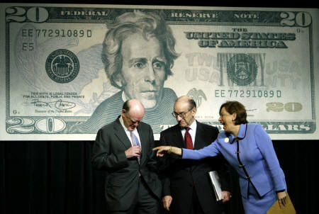 美國財長斯諾(左)與聯邦儲備理事會主席格林斯潘13日一同出席新版20美元鈔票發行儀式。