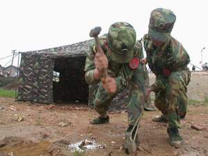 在昨日的演練中,官兵們集中演習(xí)了野外照明修理所、夜間照明、防洪子堤構(gòu)筑、植樁機(jī)植樁以及水上探險等5大軍事課目。記者在現(xiàn)場看到,這5大項目緊密相連,整個過程的完成沒有超過30分鐘,卻形成了一套非常穩(wěn)固的防洪搶險“屏障”。此外,該團(tuán)官兵還實地演練了水上救險、水上打撈以及裝卸載等課目。在50米范圍的水域內(nèi),如發(fā)現(xiàn)有人落水,沖鋒舟進(jìn)行成功救助,只需短短幾分鐘時間。