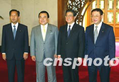 胡錦濤今天在人民大會堂會見了日本自民黨干事長山崎拓、公明黨干事長冬柴鐵三和保守新黨干事長二階俊博。
