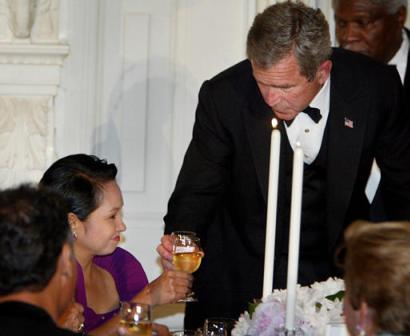 中新網5月20日電 據《華盛頓郵報》報道,布什總統在白宮為正在對美國進行國事訪問的菲律賓總統阿羅約舉行了國宴。這是布什為來訪的國家元首舉辦的第三場國宴,布什一般傾向于與來訪外國元首舉行非正式的宴會。