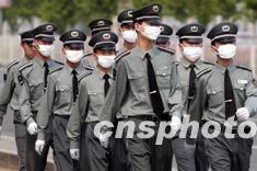 一群保安二十一日列隊走過北京街頭。盡管目前SARS疫情逐漸緩解,但有關方面提醒市民千萬不可麻痹大意、放松警惕。中新社記者:張煒
