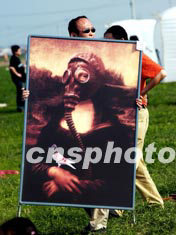 一名北京藝術(shù)家捧出戴防毒面具的《蒙娜麗莎》油像新作,參加京郊五月下旬抗擊“非典”為主題的“藍天不設防”藝術(shù)行動。中新社記者:鄒憲