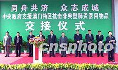 中央政府支援澳門抗擊非典型肺炎醫用物品交接儀式二十七日在拱北口岸舉行,全國政協副主席、港澳辦主任廖暉,澳門特區行政長官何厚鏵、中央駐澳聯絡辦主任白志健等出席儀式。中新社記者:李剛