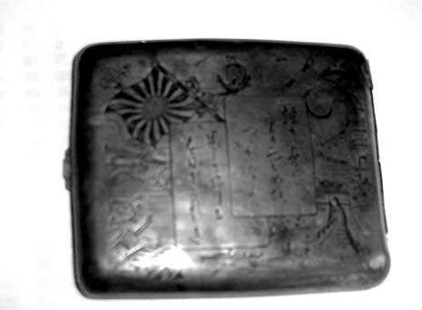 據年逾古稀的退休老干部高樓介紹,前不久,他在清理老岳父的遺物時,發現了這個日軍煙盒,請文物部門鑒定,證明是日軍侵華的又一罪證。該煙盒長90毫米,寬78毫米,厚11毫米,重71克,打開分上下兩個半盒,各可裝10支香煙。煙盒正面的圖文清晰,左右上方是兩面太陽旗,右上角一架飛機和左邊中下部一架飛機,一輛坦克,正底下兩艘軍艦,形成攻擊右邊的中國萬里長城之勢。