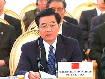 上海合作組織成員國元首莫斯科會議當地時間二十九日舉行,首次出席會議的中國國家主席胡錦濤在會上講話時闡述了中國在上海合作組織、國際新秩序等問題上的立場。(中央電視臺圖)