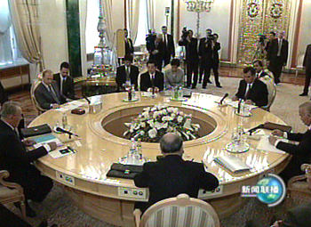 在金碧輝煌的亞歷山大廳,東道國俄羅斯總統普京、輪值主席國哈薩克斯坦總統納扎爾巴耶夫、首次出席峰會的中國國家主席胡錦濤和吉爾吉斯斯坦總統阿卡耶夫、塔吉克斯坦總統拉赫莫諾夫、烏茲別克斯坦總統卡里莫夫,圍坐在圓桌邊,按照俄文字母順序先后發言。