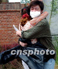 北京一位母親六月三日上午在小湯山戰(zhàn)地醫(yī)院門前,終于盼到患“非典”住院一個多月的兒子痊愈出院。母子激動擁抱,父親駕車等候身后,女友手捧鮮花站在旁邊。中新社記者:賈國榮