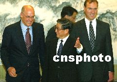 國務院副總理黃菊六月四日在北京中南海會見美國高盛集團董事長亨利.保爾森。毛建軍 攝
