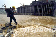 三峽水庫壩前水位六月三日十二時許升至一百一十三米高程。位于三峽壩區右岸地下電站機組進水口開始進水。圖為三斗坪中堡村移民莊德新正走過機組進水口施工現場。作者:孫榮剛