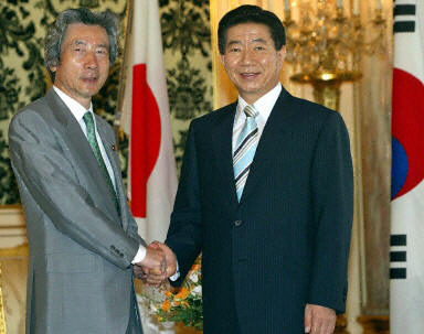 日本首相小泉純一朗(左)和韓國總統盧武鉉(右)親切握手