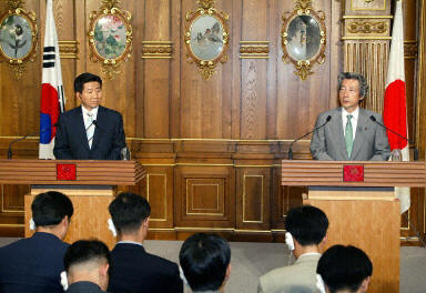 小泉純一朗(右)和盧武鉉(左)舉行聯合記者招待會
