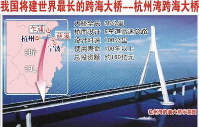 杭州灣跨海大橋的建設,是中國沿海大通道的重要組成部分,是寧波和浙江接軌大上海、融入“長三角”、走向國際化的重大舉措,也是進一步密切浙蘇滬三地經濟社會交流與合作的紐帶,對促進“長三角”地區(qū)的一體化發(fā)展,提升國際化、現(xiàn)代化水平,增強區(qū)域經濟競爭力,全面建設小康社會,提前基本實現(xiàn)現(xiàn)代化,具有很強的現(xiàn)實意義和深遠的歷史意義。