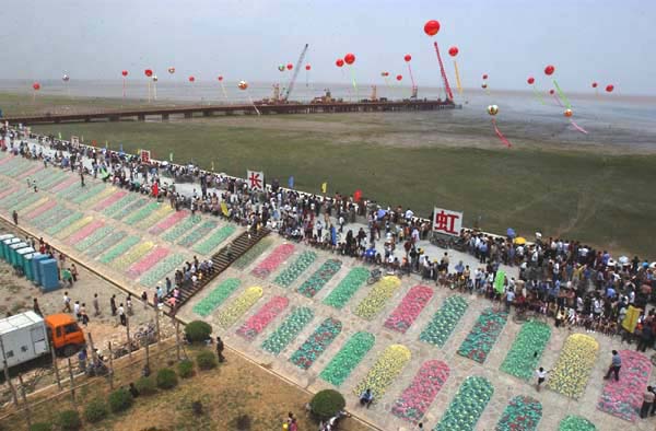 中新網6月8日電 杭州灣跨海大橋工程奠基儀式今天下午2時16分在慈溪市庵東鎮(zhèn)杭州灣大橋工程指揮部氣墊船專用碼頭舉行。