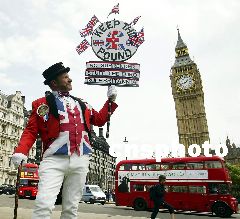 6月9日,英國財政大臣戈登·布朗宣布英國暫時不會加入歐元區。圖為英鎊的堅定支持者在英國首都倫敦街頭高舉標語牌,號召維護英鎊,抵制歐元。Ic/cnsphoto 攝