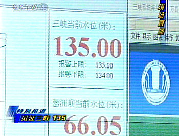 三峽水利樞紐梯級(jí)調(diào)度通信中心的大屏幕顯示水位達(dá)到135米。