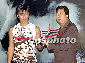 歌星謝霆鋒6月11日在香港舉行新碟發(fā)布會(huì),英皇娛樂高層吳雨向霆鋒送上模型飛機(jī),祝賀其歌唱事業(yè)將一飛沖天。鄧慶樂 攝