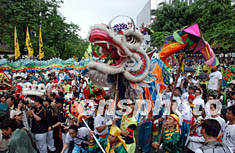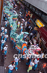 六月十五日在香港舉行的千人舞龍舞獅大巡游中,一條二百五十尺長龍穿街走巷,成為活動中一道亮麗風(fēng)景。潘索菲 攝