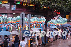 六月十五日,盡管香港下著大雨,但是依然有數(shù)萬市民冒雨觀看千人舞龍舞獅大巡游。潘索菲 攝