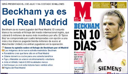 英國(guó)報(bào)紙指出,貝克漢姆轉(zhuǎn)會(huì)皇馬有眾多先兆