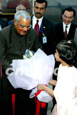 二十二日晚乘專機抵達北京的印度總理瓦杰帕伊在機場接受印度小姑娘獻上的鮮花。中新社記者:鄭萍萍